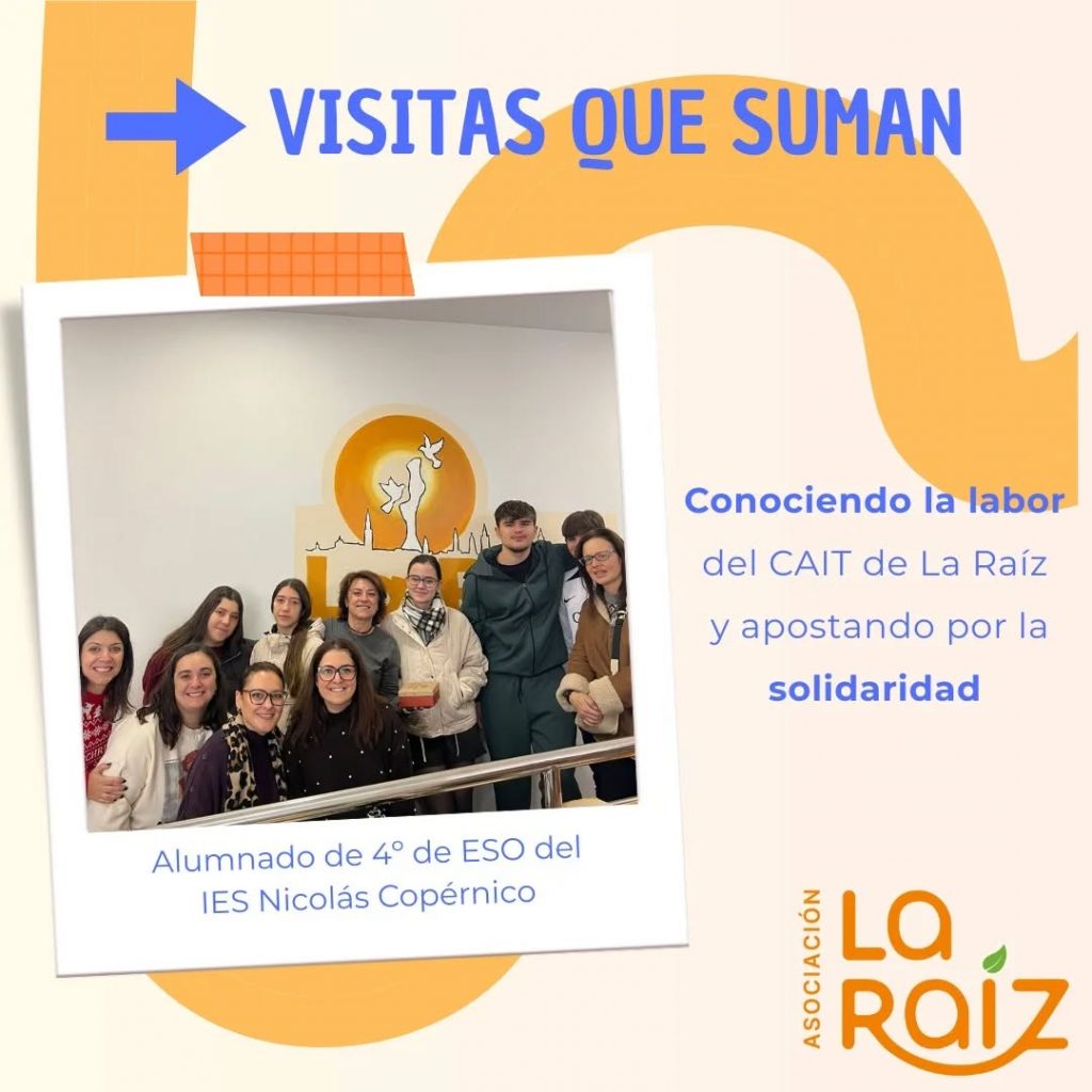 El pasado 19 de diciembre, alumnos de 4º ESO colaboradores en el III Mercadillo Solidario celebrado en el IES Nicolás Copérnico visitaron el CAIT de «La Raíz», en calle Berbisa (Écija). Allí conocieron de primera mano el modelo de intervención en atención temprana dirigido a niños y niñas de 0 a 6 años y sus familias.
