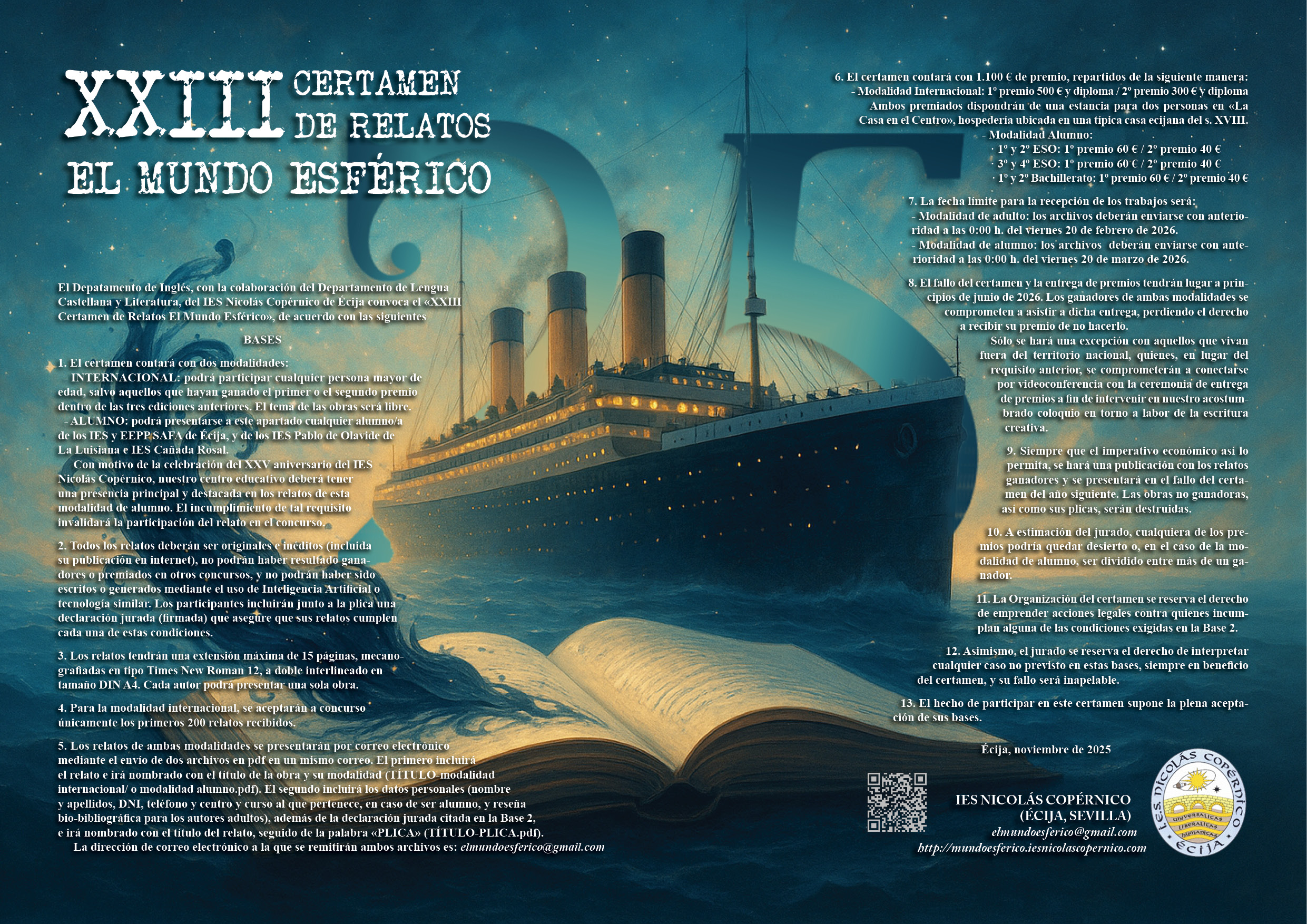 En cuanto a la temática para los alumnos, se da la circunstancia de que este curso celebramos el XXV aniversario del IES Nicolás Copérnico. Por ello: «nuestro centro educativo deberá tener una presencia principal y destacada en los relatos de esta modalidad de alumno. El incumplimiento de tal requisito invalidará la participación del relato en el concurso» (citado de la Base 1).